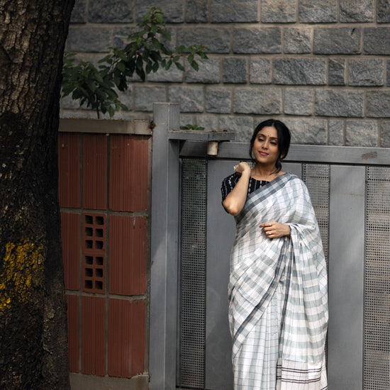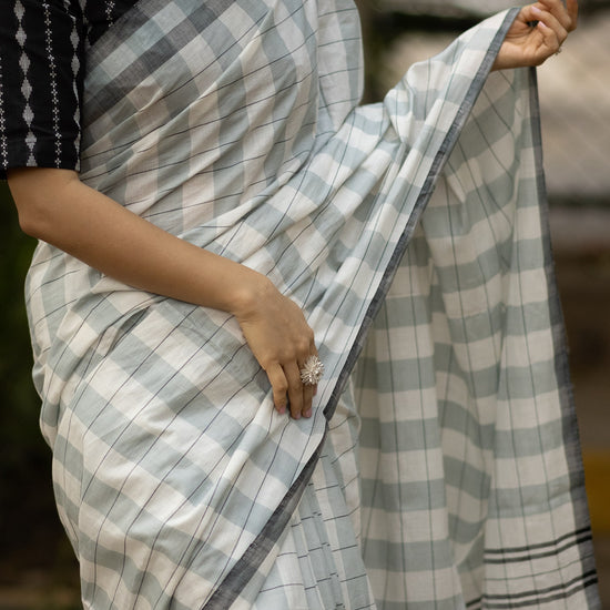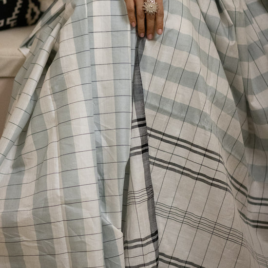 This pleasant looking saree has a pastel green and grey shaded lines. The soft colours suits the soft mercerised cotton yarn used to weave the saree.