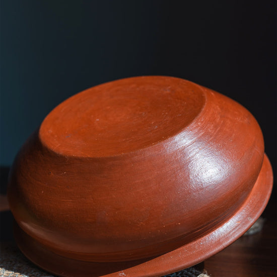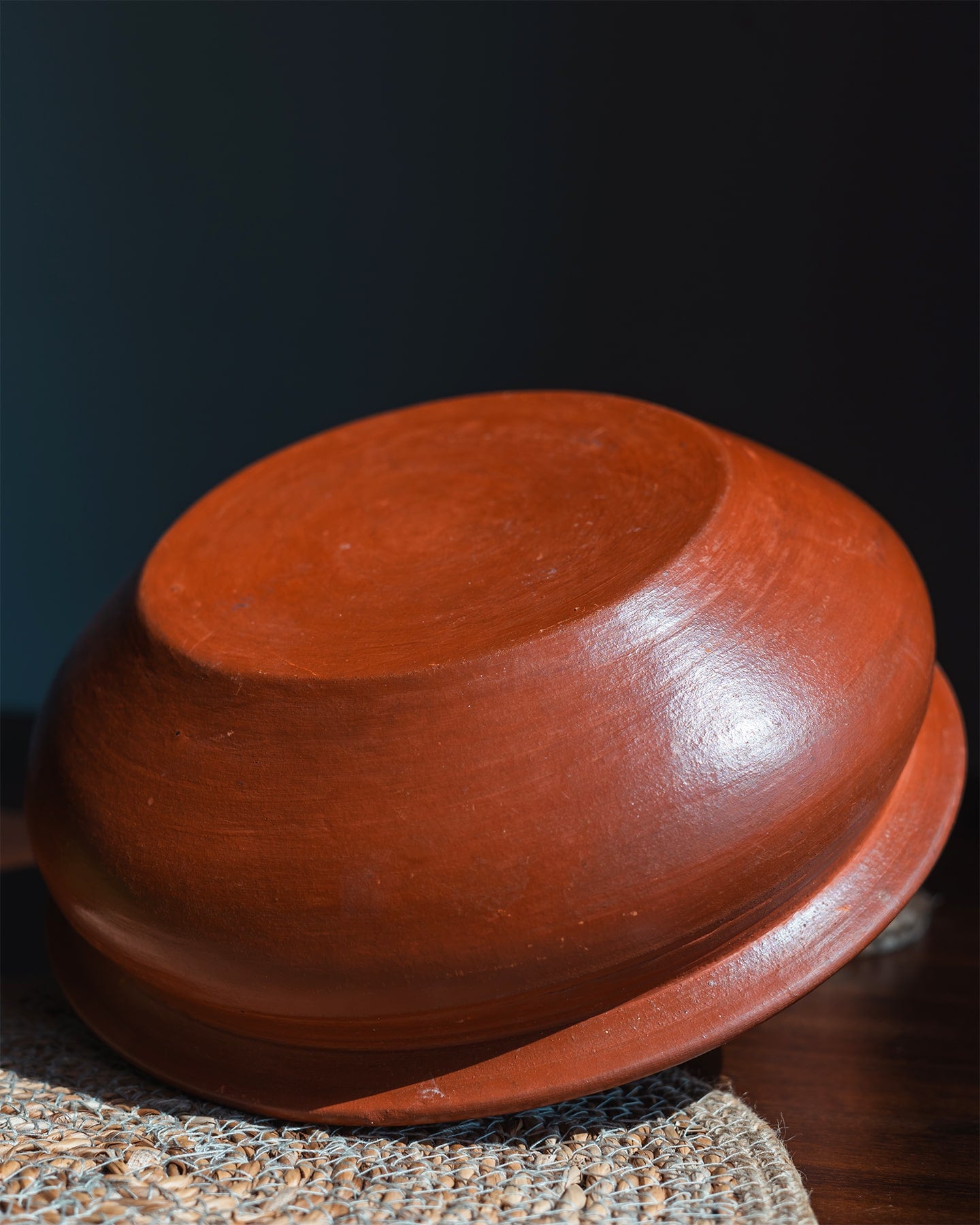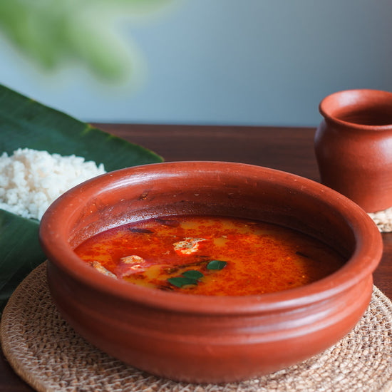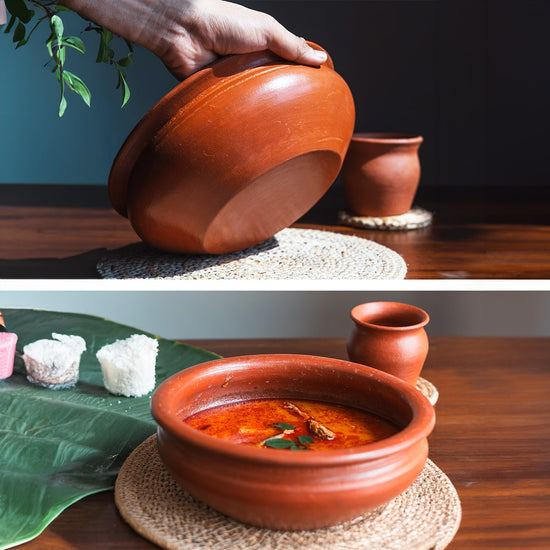 The traditional cooking vessel of Kerala, with a modern twist. This vessel has a flat bottom for cooking on electric flat surface stoves. It is generally used to cook fish. But, the vessel can be used to cook any curry. Our potters have put in that extra effort to polish it with special clay, and it can be taken from stove to table. A unique cook and serve ware for your kitchen.