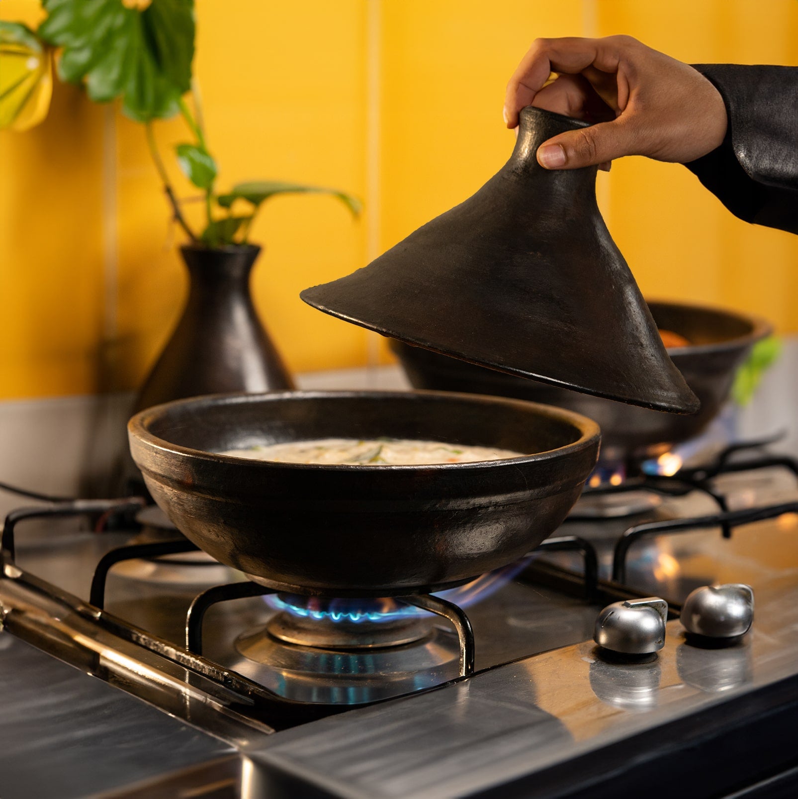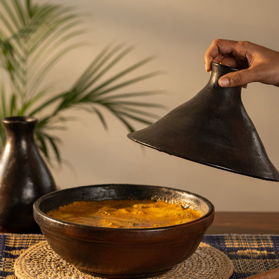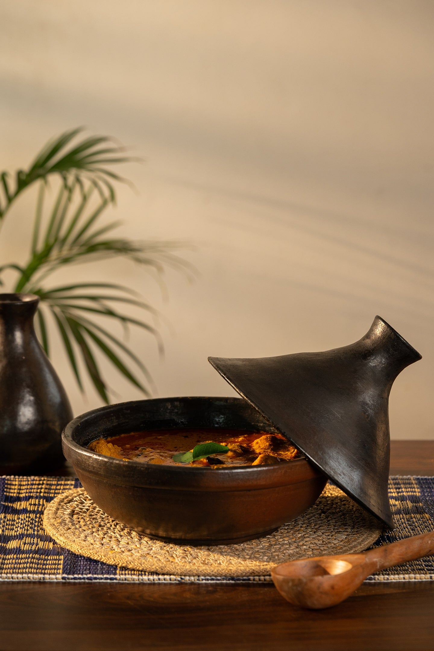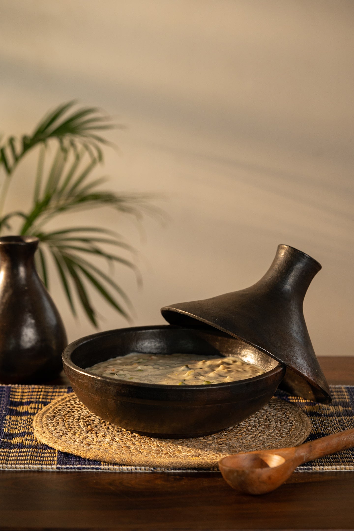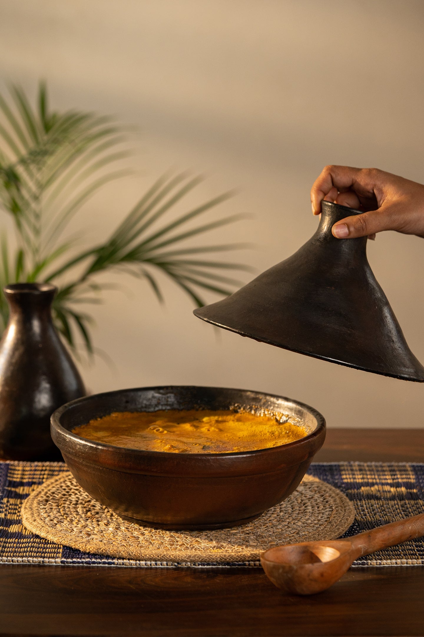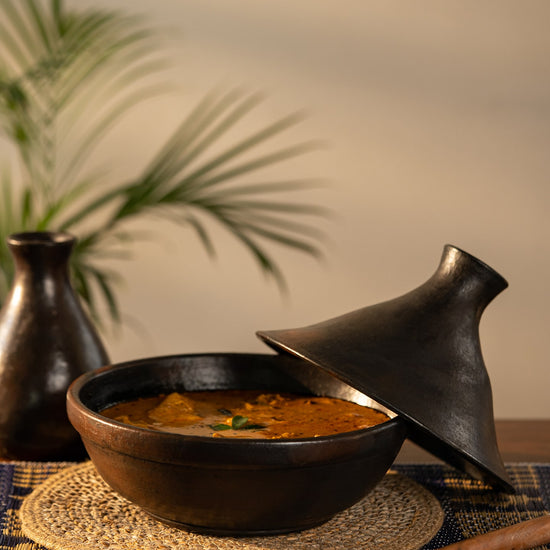Ruchi Terracotta Cook and Serve Pot is inspired by the 'Tagine" pot popular in North Africa and Middle East countries. A tagine-style pot helps to trap the steam within the pot, helps to cook without adding much water, and improves the flavour of the food. It is well documented that slow cooked food tastes better and helps to preserve nutrition. Ruchi Pot is aesthetically crafted to double up as a serving ware. The conical lid helps to keep the food warm.