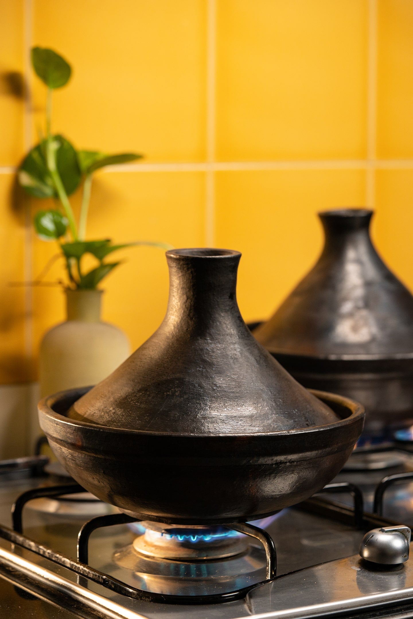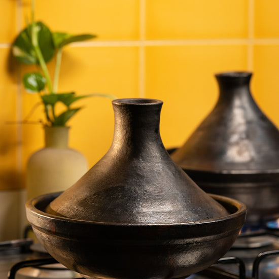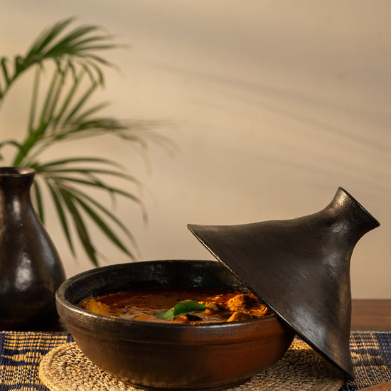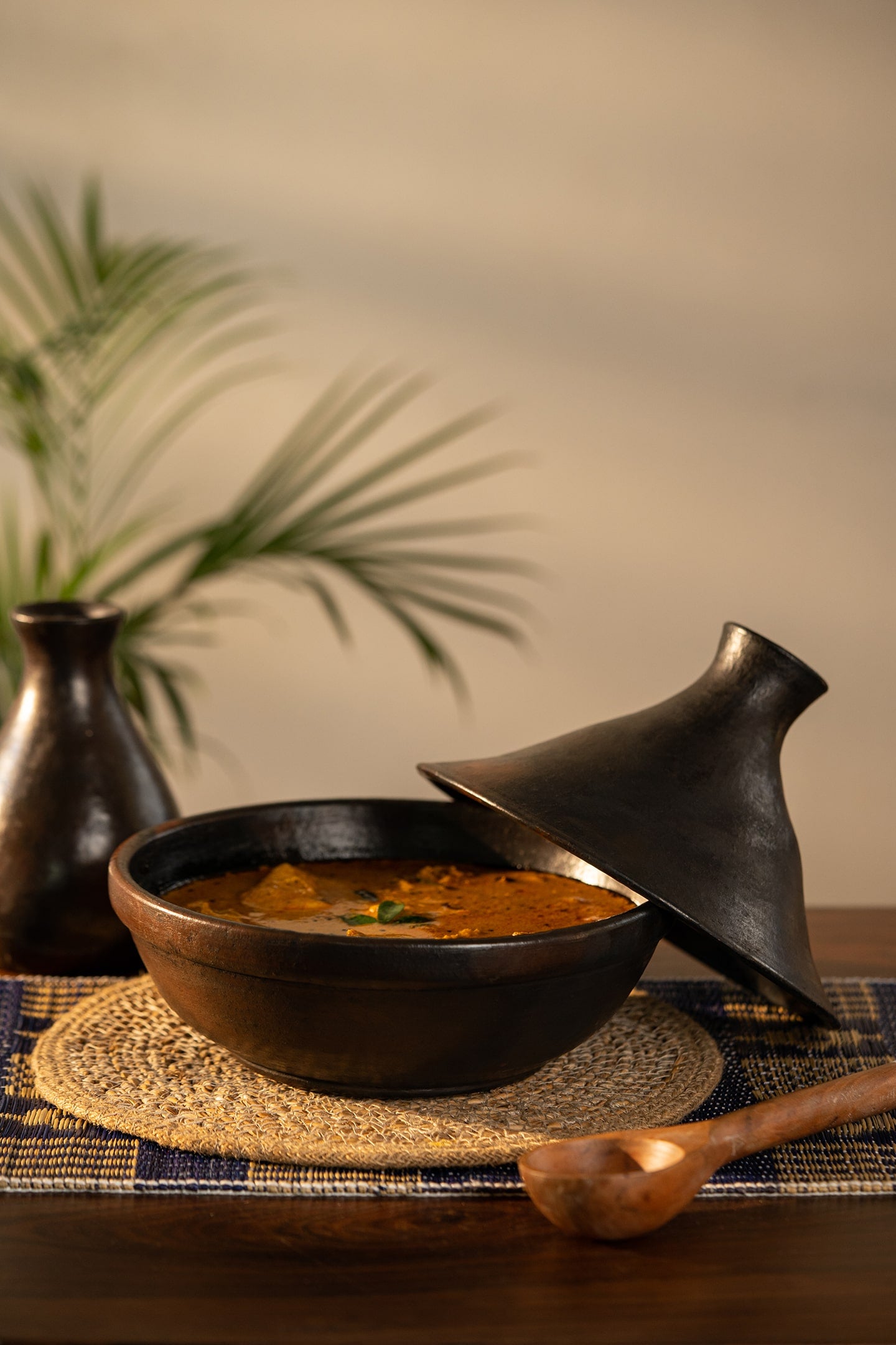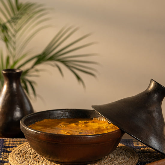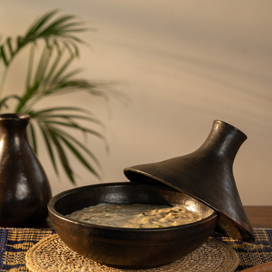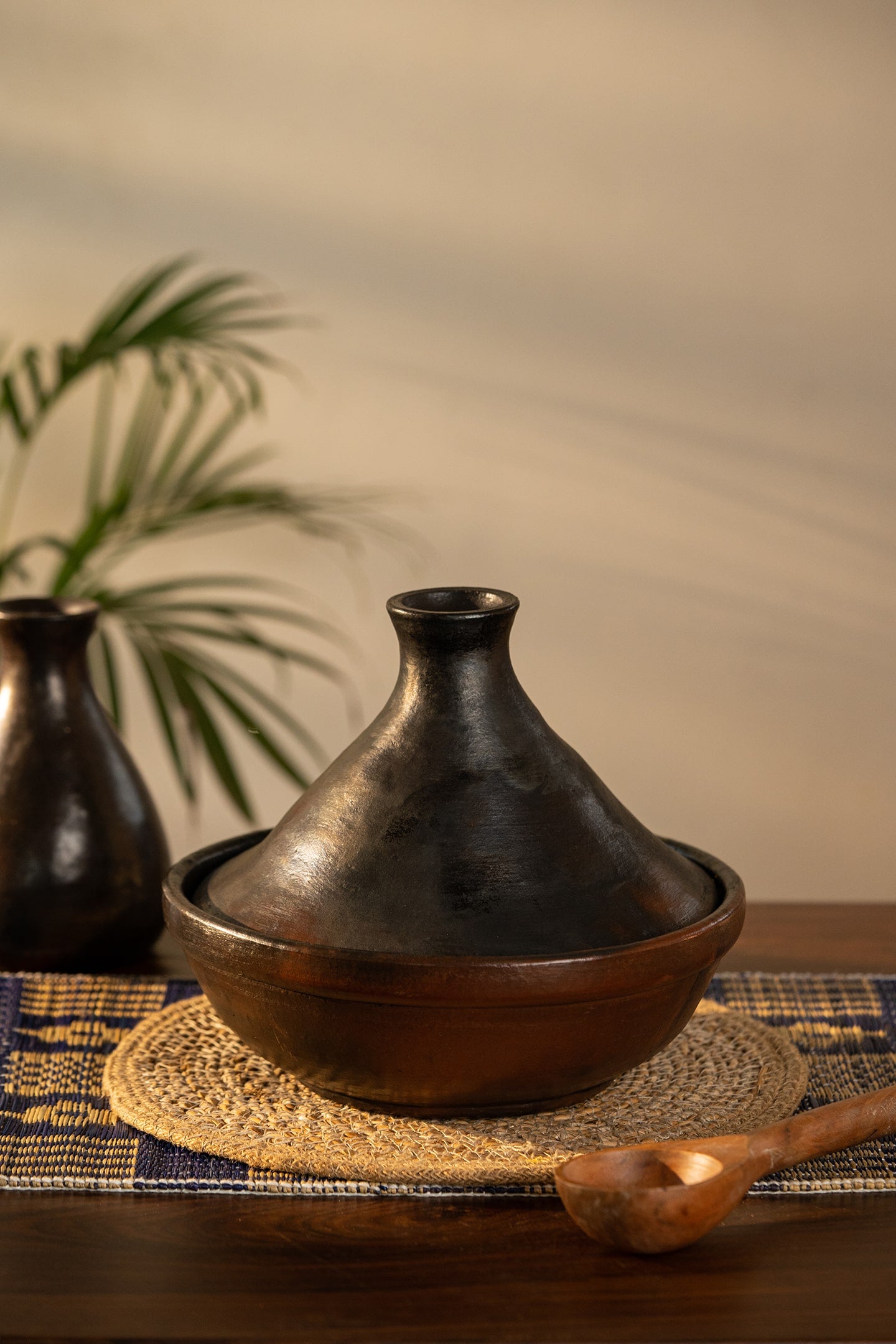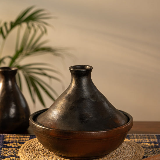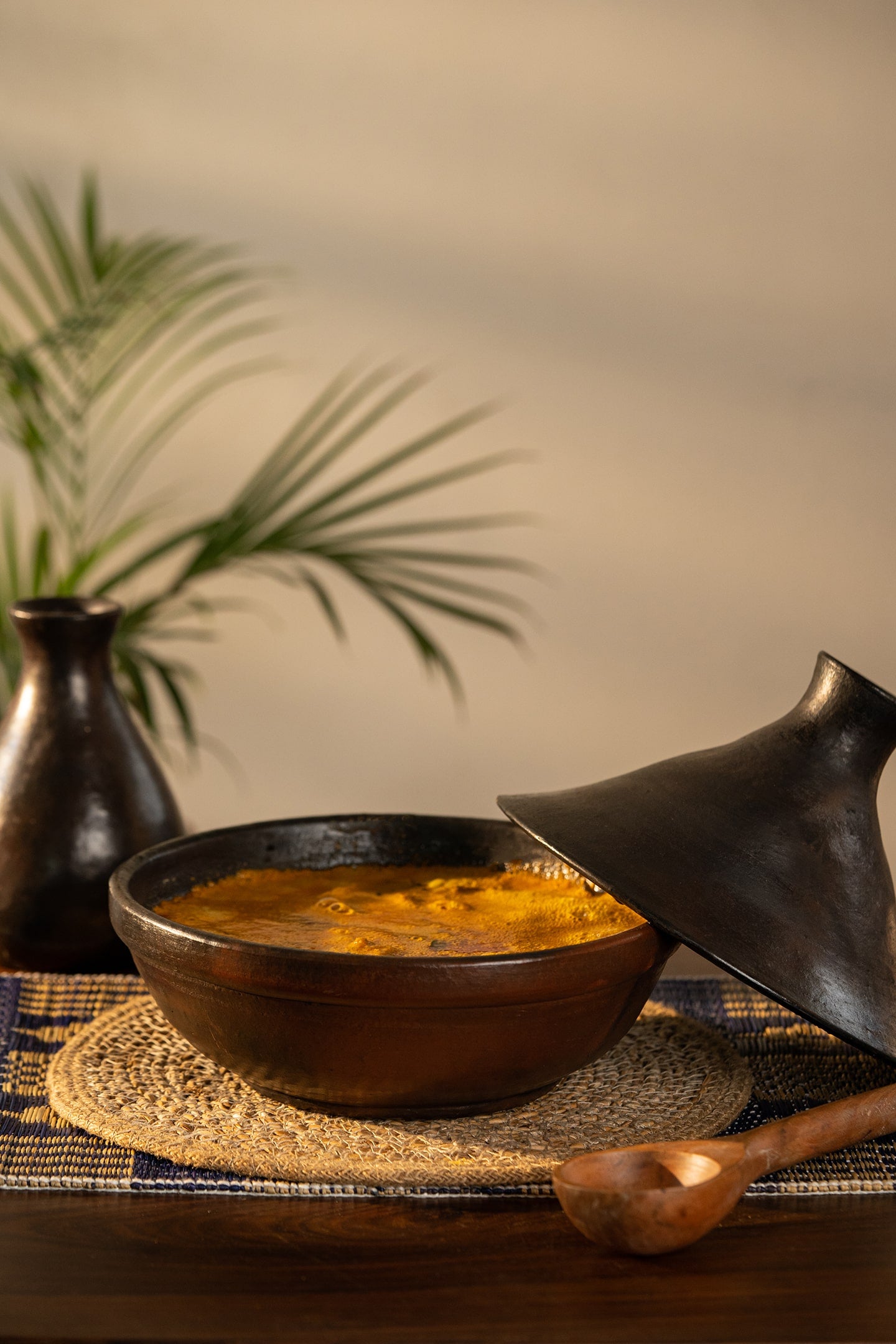 Ruchi Terracotta Cook and Serve Pot is inspired by the 'Tagine" pot popular in North Africa and Middle East countries. A tagine-style pot helps to trap the steam within the pot, helps to cook without adding much water, and improves the flavour of the food. It is well documented that slow cooked food tastes better and helps to preserve nutrition. Ruchi Pot is aesthetically crafted to double up as a serving ware. The conical lid helps to keep the food warm.