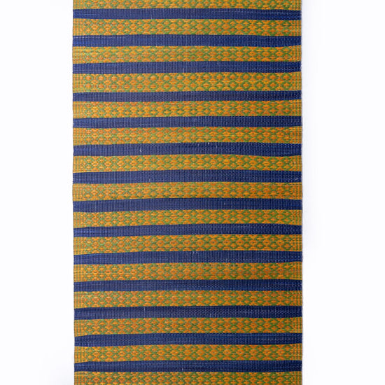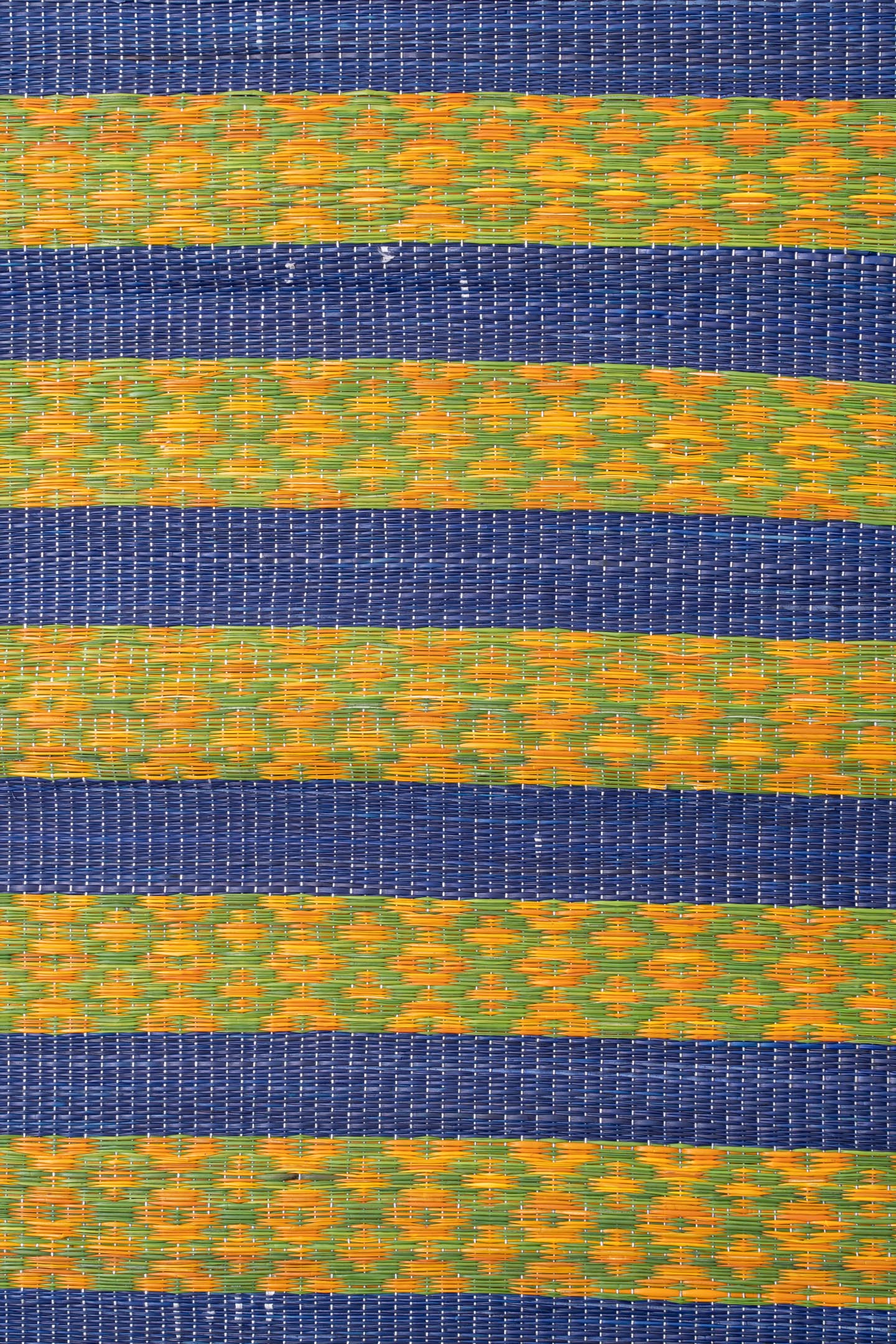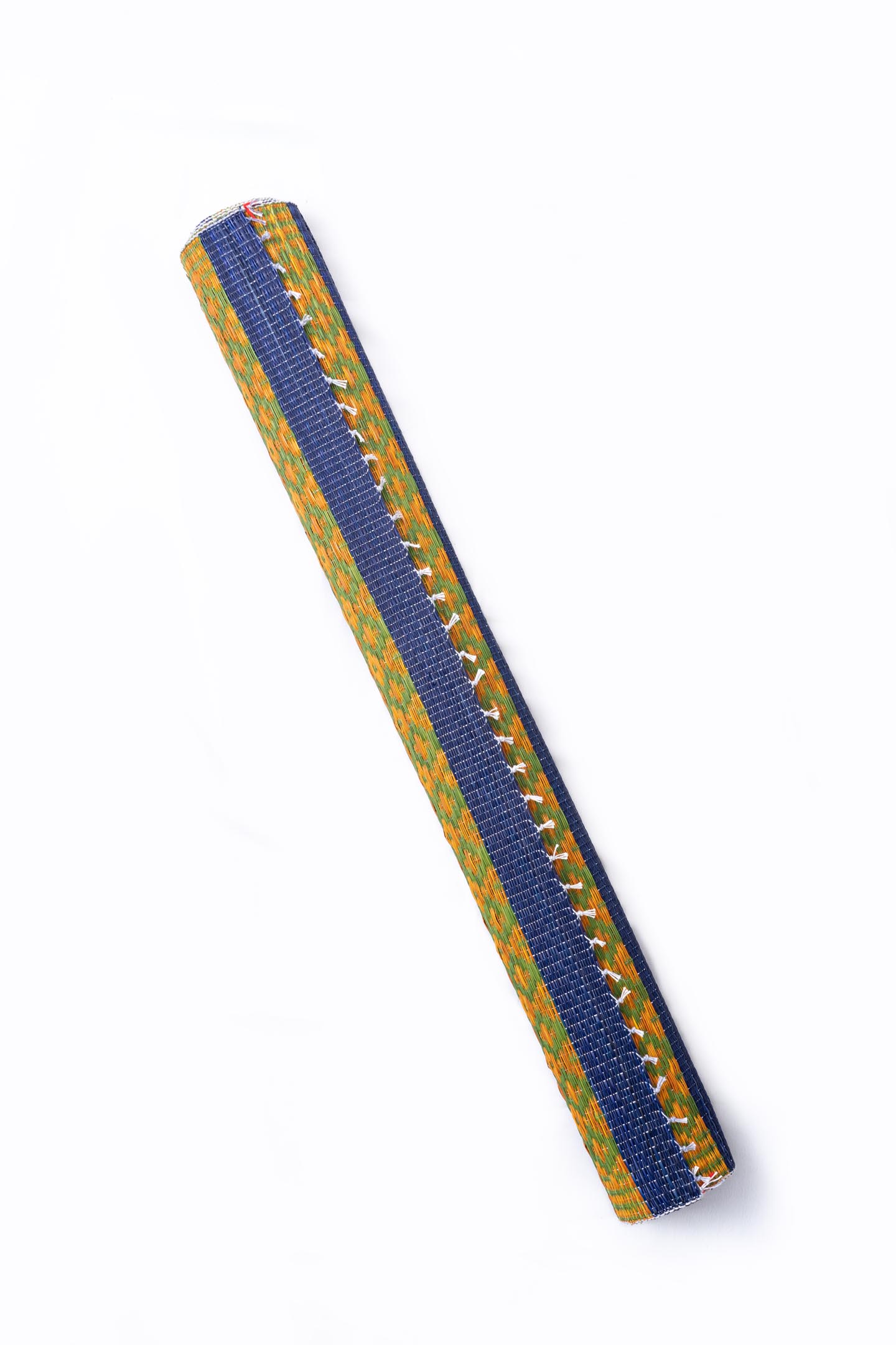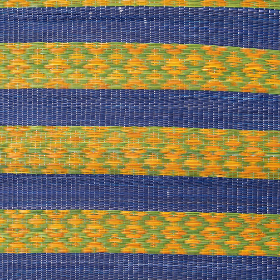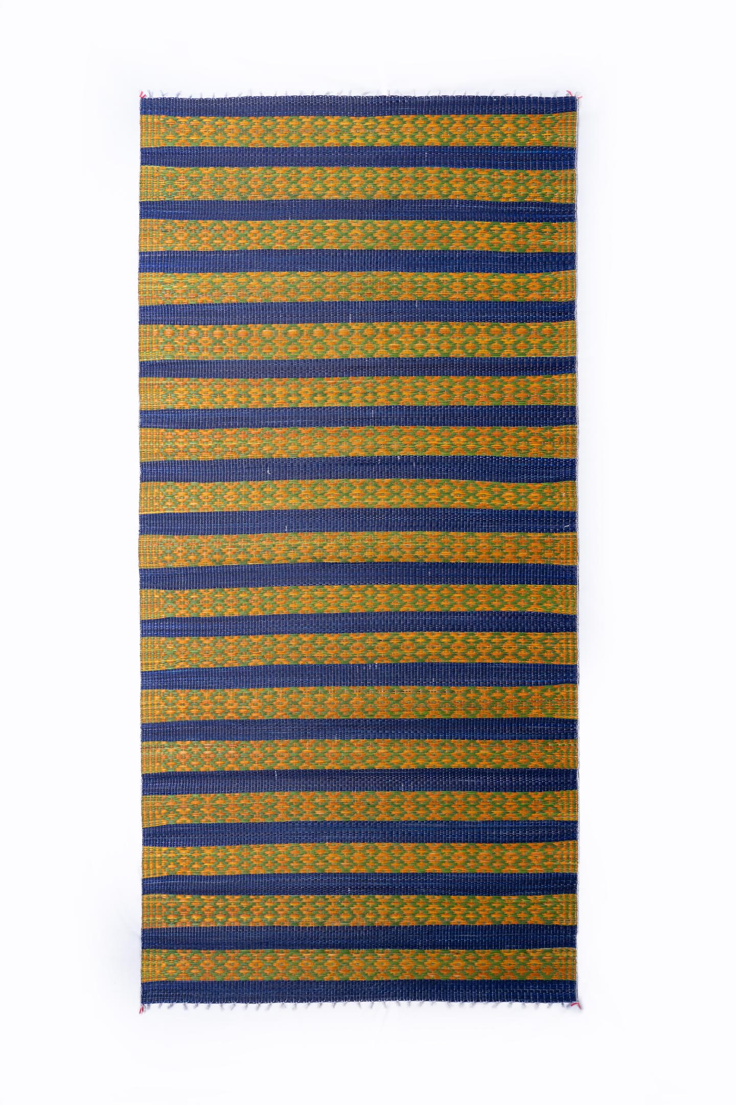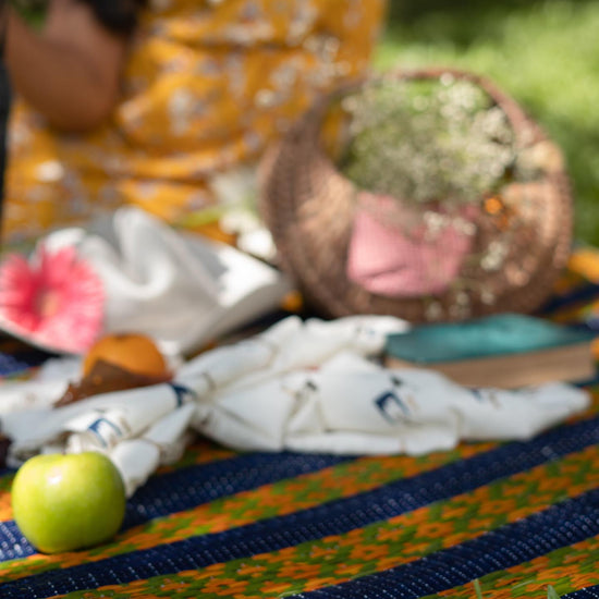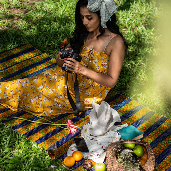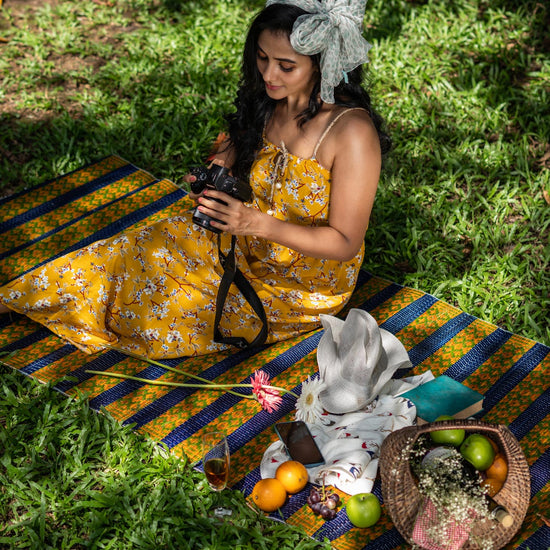 A comfortable mat handcrafted from natural grass by weavers in Kerala. Women who had woven the mat wanted to have a dash of turmeric yellow sprinkled with the green colour of beetle nut leaves and bordered with blue. Here is the Saantham mat to calm your nerves, whether you stay indoors or prefer a relaxing outing in the park.